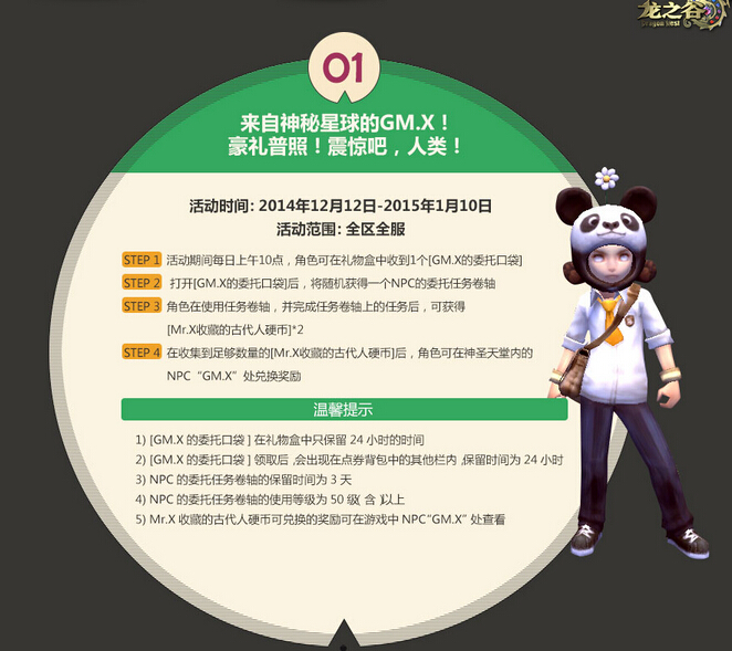 《龙之谷》天堂中瞭望台下的GM.X出现了大半个月,估计小伙伴们已经迫不及待的要去他那里兑换好东西了。《龙之谷》实现了小伙伴们的愿望,活动期间,每天10点,小伙伴们可以在礼物盒中收到一个【GM.X的委托口袋】,小伙伴们只要打开那个口袋,就能随机获得一个NPC的额外i拖任务卷轴。使用任务卷轴并且完成卷轴上的任务后,就能获得2个【Mr.X收藏的古代人硬币】。只要手机足够【GM.X收藏的古代人硬币】,就能找到GM.X这个大人物,兑换奖励拉。在这个商店里,不仅仅有各种游戏道具,还有商城道具哦。